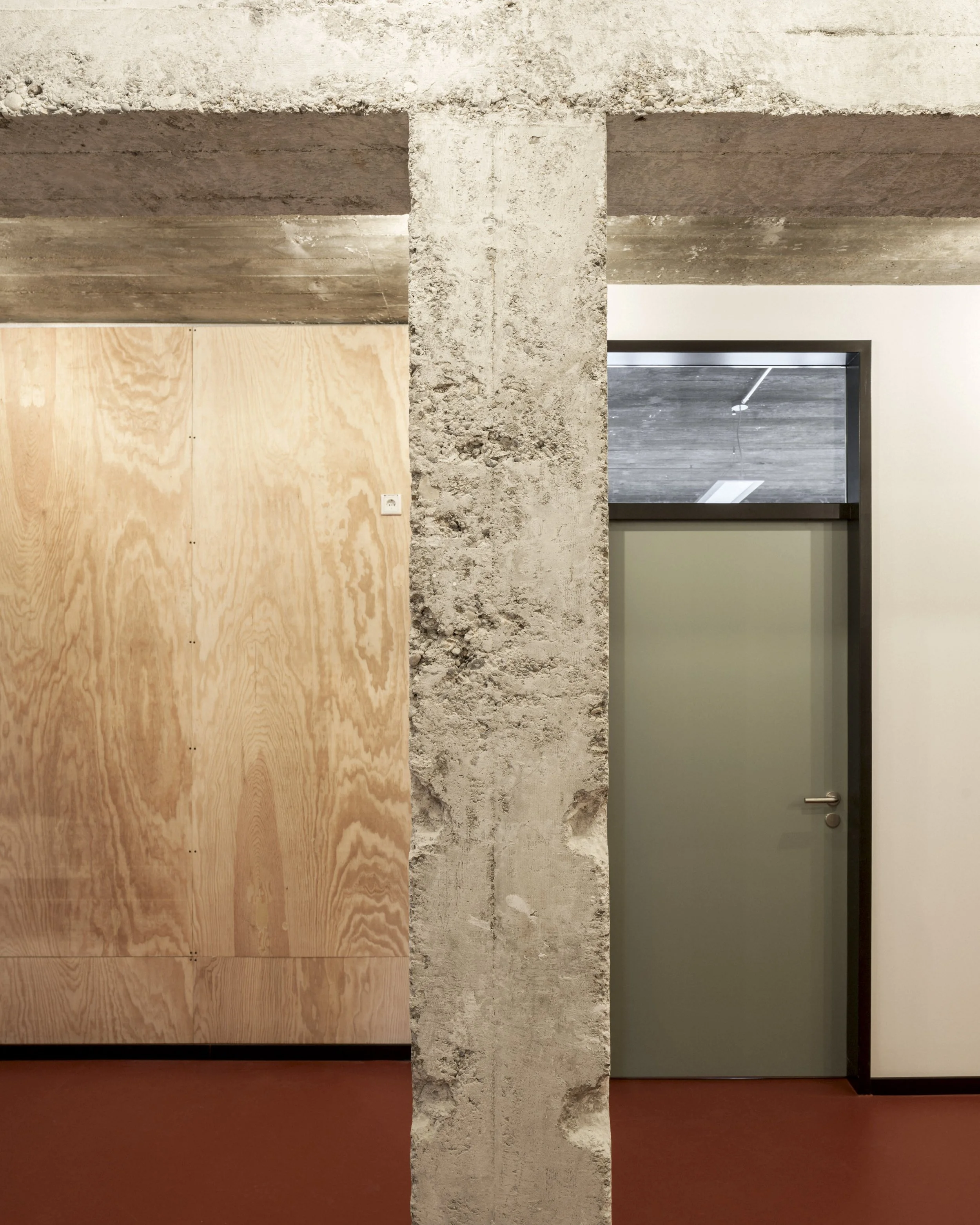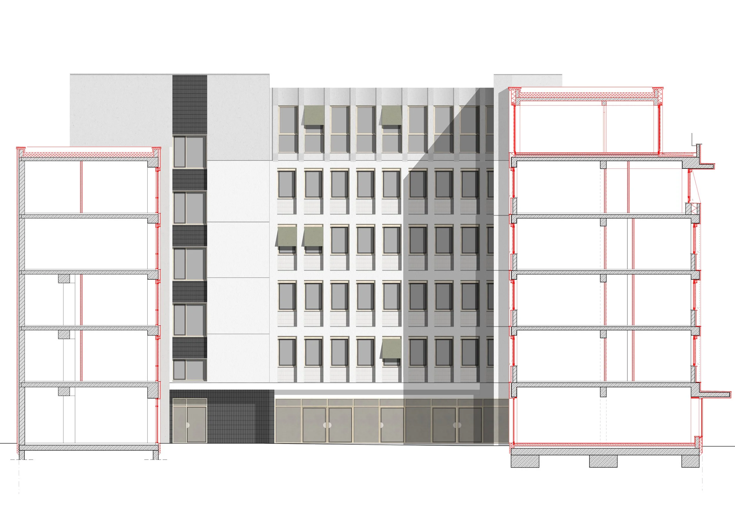In den Jahren 1949 – 53 planten und bauten der Architekt Josef Elfinger und sein Lehrmeister Franz Xaver Proebst das Verlagsgebäude des Donaukurier und platzierten damit einen der ersten modernen Bauten der Nachkriegszeit in Ingolstadt. Das flexible Grundrisskonzept, die einspringende Schaufensterverglasung des Erdgeschosses, die Rasterfassade sowie ein leicht abgesetztes oberstes Stockwerk avancierten in dieser Zeit zu einer Art Prototyp beim Entwurf neuer Geschäfts- und Bürogebäude. Mit dem Erweiterungsbau nach Südwesten wird das Gebäude zum innerstädtischen Ensemble. Viele Eingriffe in den 1970er bis Ende der 1980er Jahre veränderten seine Anmutung, durch die Auslagerung der Druckerei änderte sich auch die Grundrissstruktur im Gebäudeinneren. Nach dem Verkauf des Donaukurier war längere Zeit unklar, ob das Gebäude dem Abbruch zum Opfer fallen oder mit einem neuen Nutzungskonzept versehen und erhalten werden könnte. Unsere Studie konnte die Aufstockung des Volumens um ein zurückversetztes fünftes Obergeschoss vorstellbar machen. Teil des Entwurfsvorschlags waren Rückbau EG und ensemblegerechte Sanierung der Fassaden im Duktus der 1950er Jahre mit dem Anspruch einer maßvollen energetischen Ertüchtigung. Dabei wurde insbesondere beim hinzugekommenen Dachaufbau Wert auf die Weiterführung der stilprägenden Fassadenstruktur gelegt, was sich in der Sichtbarmachung der primären Tragstruktur und der Fenstergliederung manifestiert. Auch bei der Material- und Farbwahl von Fenstern, textilem Sonnenschutz, Fassadeverkleidung, Keramikplatten wurde der bauzeitliche Kanon zugrunde gelegt. Hochwertige Aluminiumfenster in Neusilber (EV2H) zeichnen die ursprünglichen Fensterteilungen nach, Stoffbahnen in gedecktem Grün bilden als Ausstell-Elemente eine bauliche Einheit mit den Fenstern, Putzkörnung und -farbigkeit orientieren sich am Ursprungsbau, schwarze keramische Fassadenfliesen fassen den Sockel des Erdgeschosses und schützen ihn so vor mechanischen Einwirkungen. Das signifikante Vordach bleibt in seiner Anmutung erhalten und wird nur unterseitig mit reduzierter Dämmung thermisch eingehüllt. Die Haupteingangstüren zum Erdgeschoss, in dem Foyer, Ausstellungsräume und ein kleines Café für alle sichtbar an der Straße liegen werden, sollen mit klassischen Türgriffstangen aus der Zeit der Wirtschaftswunderjahre geöffnet werden. Dabei geht es weniger um denkmalgerechten Rückbau auf den Urzustand, sondern die Transformation des Gebäudes in die Jetztzeit mit Respekt, Detailgenauigkeit und ästhetischer Stringenz.
