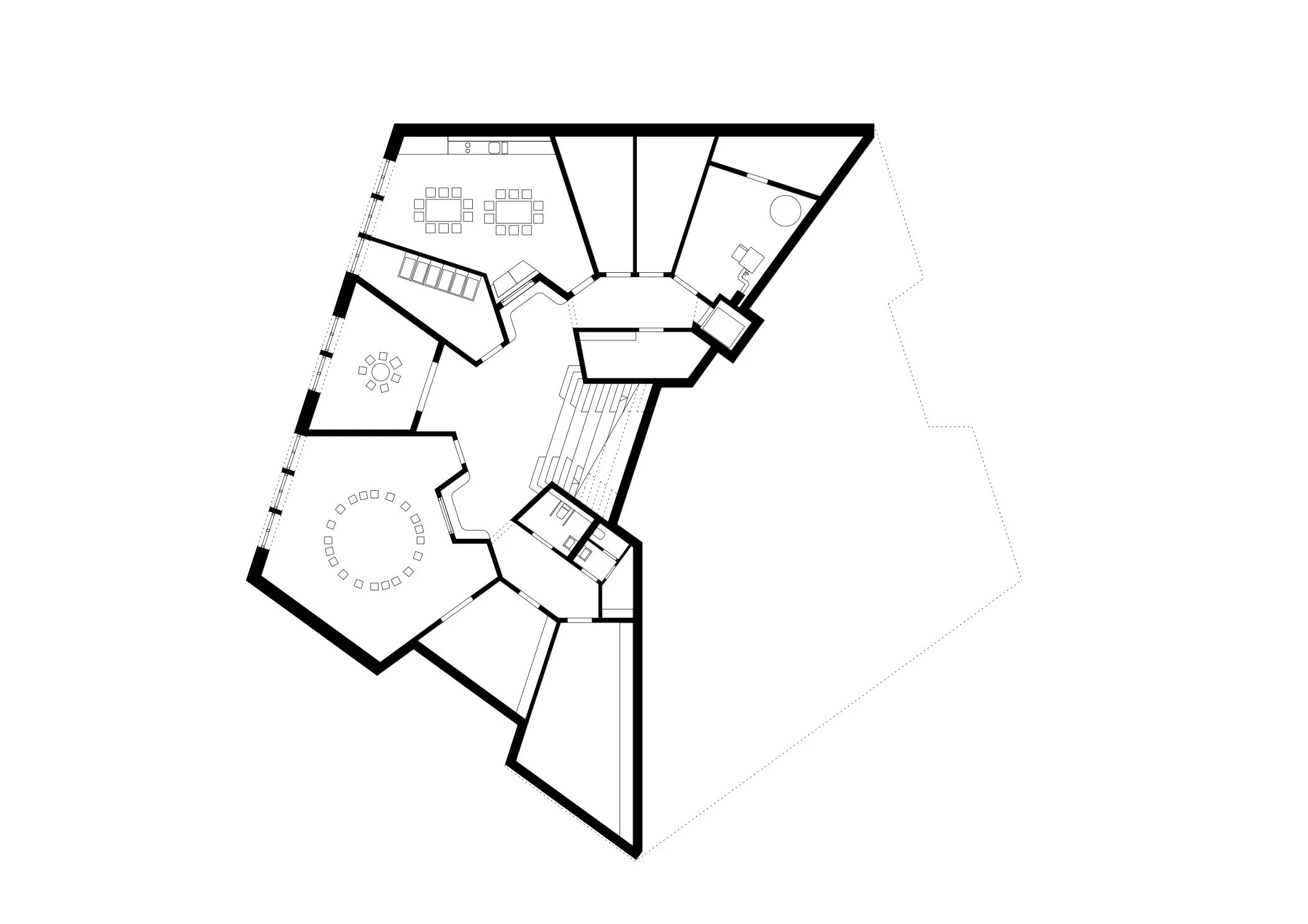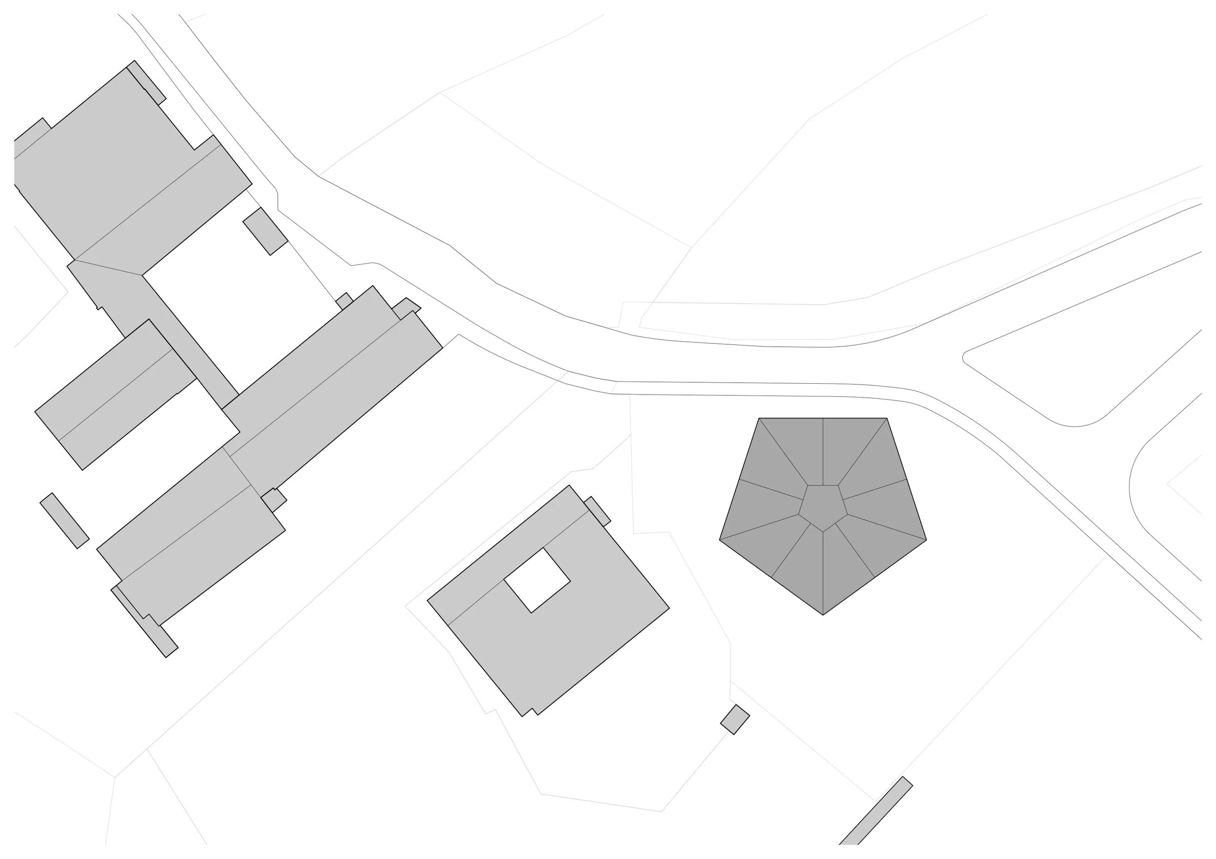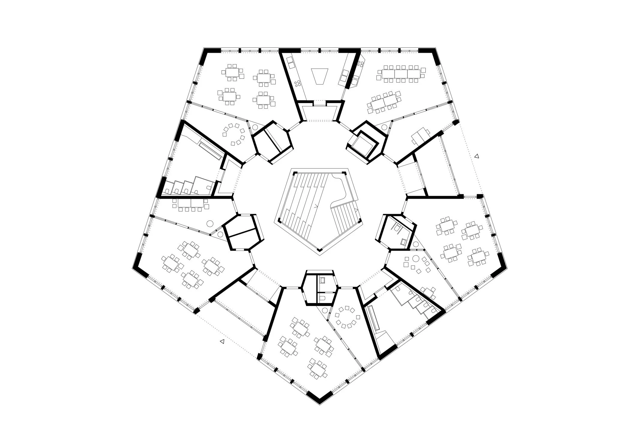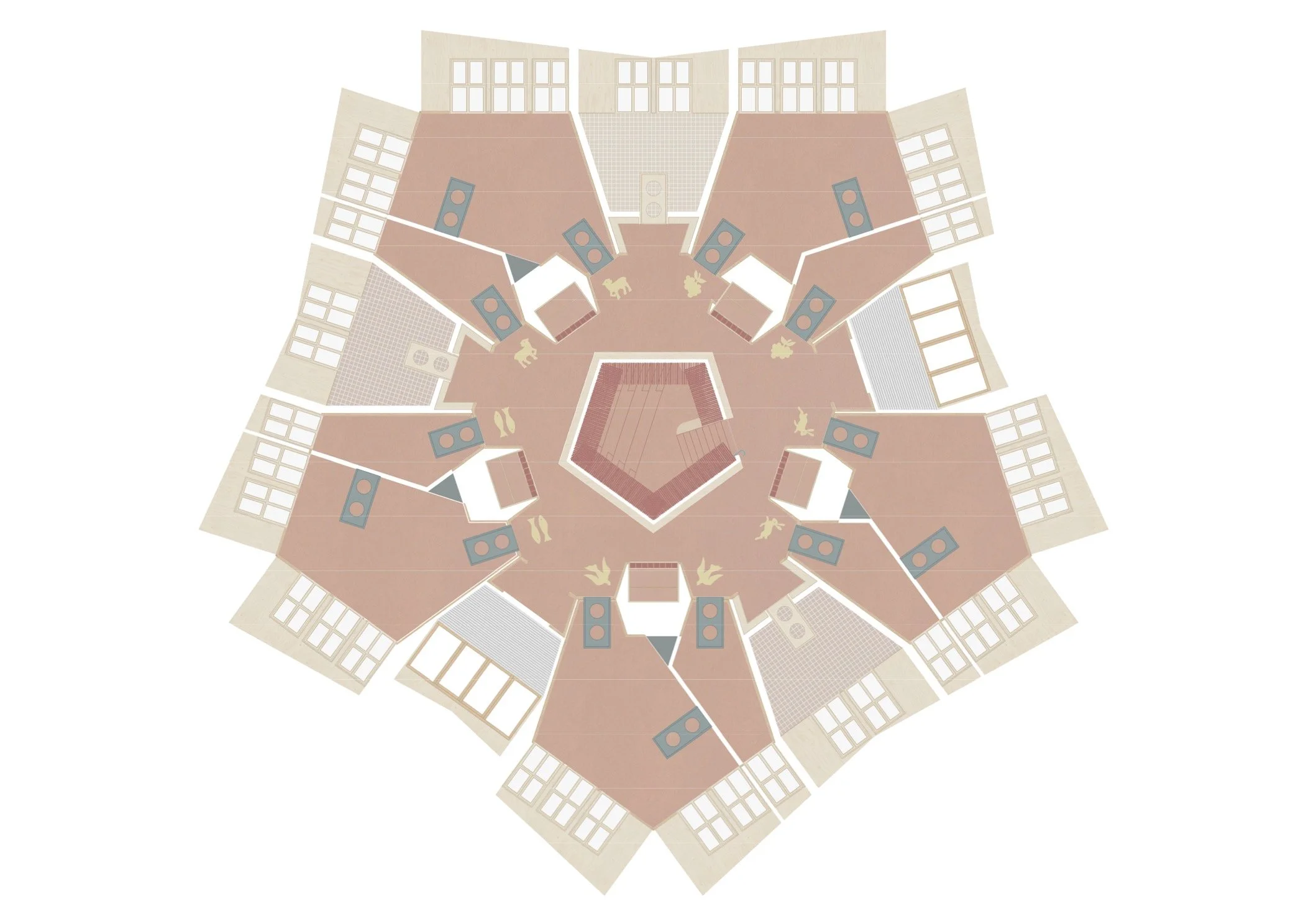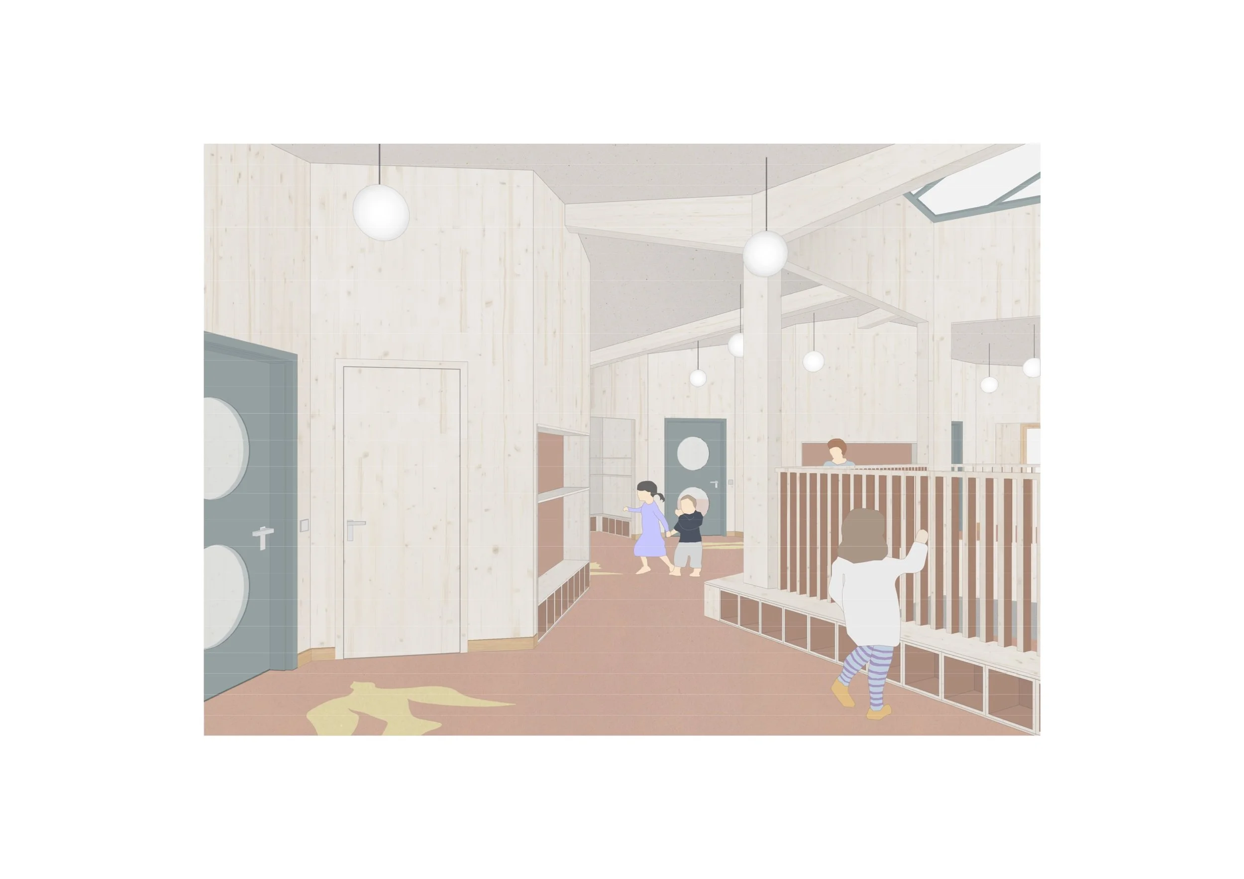 Der fünfeckige, inklusive Kindergarten kommuniziert zu allen Seiten mit der angrenzenden Landschaft. Er bettet sich wie ein geschliffener Stein in die umgebenden Freiflächen mit Eingangshof, Hang, Garten, Tal und Straße. Das gefaltene Dach mit zentralem Oberlicht prägt die innenräumliche Struktur und Ordnung des Hauses. Eine zentrale Treppenlandschaft mit mäandrierendem Spiel- und Garderobenflur bilden dabei das Herz der Einrichtung und kommt unter dem zentralem Dachstern mit Oberlicht zu liegen. Von hier aus werden die vier Gruppenräume und der Speisesaal in den Gebäudeecken sowie alle dazwischenliegenden Nebenräume und zellenförmige Kerne erschlossen.
